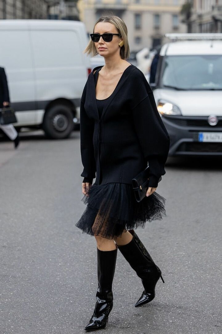 きりっと引き締まったオールブラックコーディネートには、細かなドット柄が愛らしい、ミドル丈のチュールスカートを効かせ遊び心をトッピング。モードなパテントレザーブーツを合わせると、甘さと辛さが絶妙に調和したスタイルが完成します。