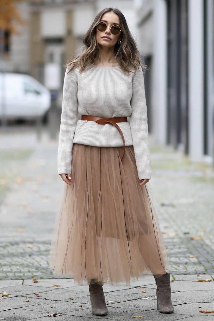 繊細な黒のラインが印象的なベージュチュールスカートには、シンプルなオフホワイトのニットがお似合い。トップスをベルトマークし、着膨れを防止しながら大人のフェミニンスタイルをコンプリート。