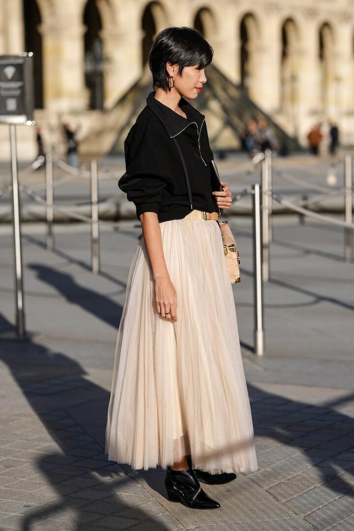 チュールスカートにトライしたいけれど、甘さやボリュームが気になる… そんなときはシックの名手「黒」を味方に。全体を引き締めてくれるので、自然とモダンな印象に仕上がります。