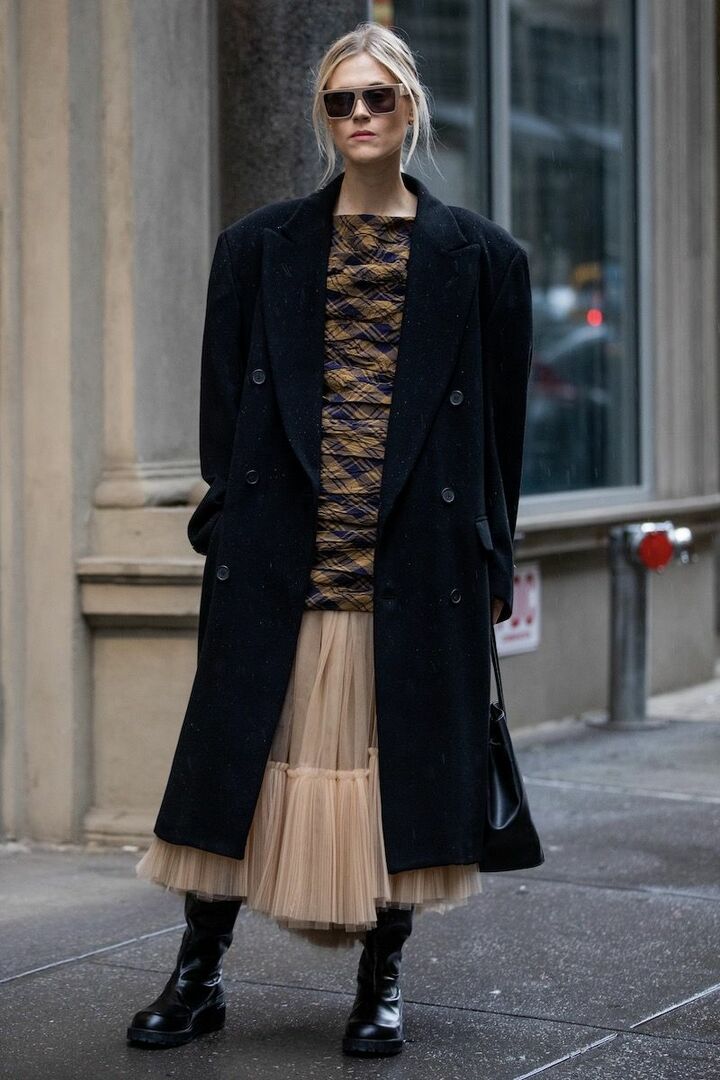 チェック柄トップスとベージュチュールスカートのフェミニンな装いに、真逆な印象のパワーショルダーコートとワークブーツのモードな黒アイテムをプラス。相反するミックススタイルで、上級者な甘辛スタイルへ。狙ったアンバランスさが、そのまま着映えに直結。