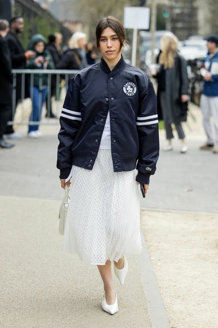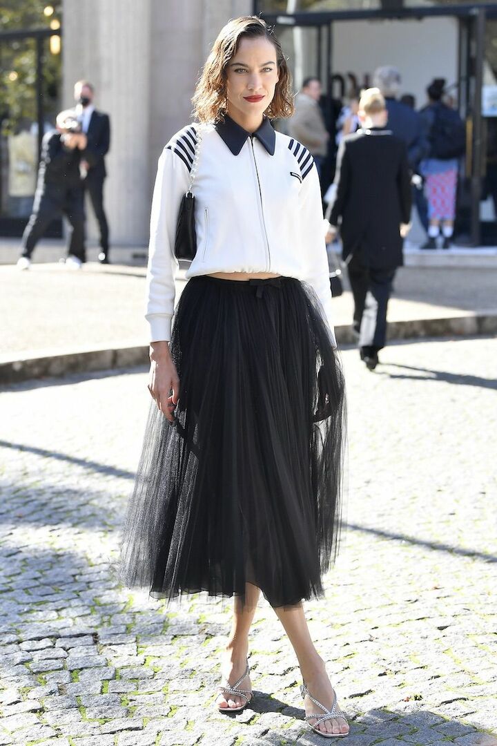 黒のミモレフレアスカートは、アレクサ・チャンのようなチュール素材にすると、それだけでドラマティックな印象に。甘さがトゥーマッチにならないよう、外し役としてライン入りの白スポーティブルゾンを組み合わせて。スカートにボリュームがあるので、小物はコンパクトな形をセレクトすると好バランス。