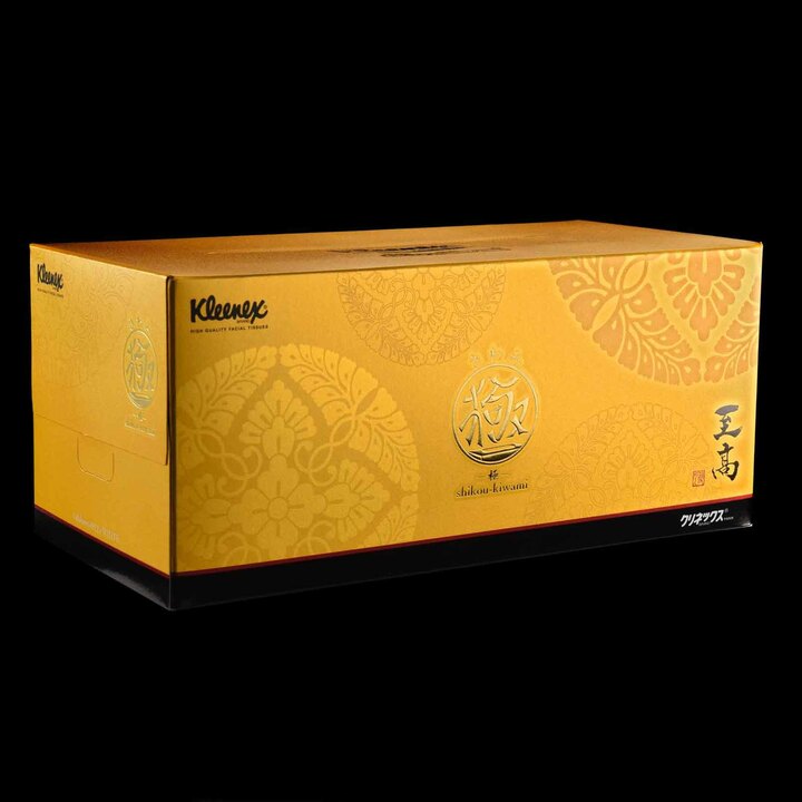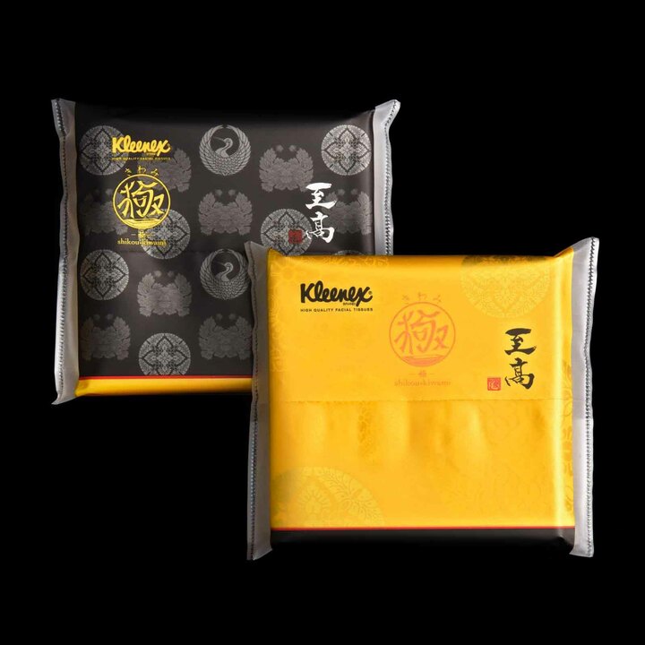 至高シリーズのティシューを、店頭でも購入したいという声に応えて2016年に登場した、至高シリーズ「極」。原料は、針葉樹と広葉樹を黄金比率で配合したブランドパルプ。パッケージには日本文化の象徴ともいえる文様がモチーフに取り入れられている。座布団型を採用したポケットティシューも販売。