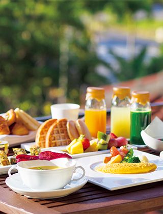 また、朝食は「グスク」にて人気のブッフェを。海ぶどうやゴーヤチャンプルなど日替わりで沖縄料理が並ぶほか、焼きたてパンやフレッシュジュースにオムレツのライブキッチンなど、多彩なメニューがずらり。開放感あふれるテラス席でぜひ。
