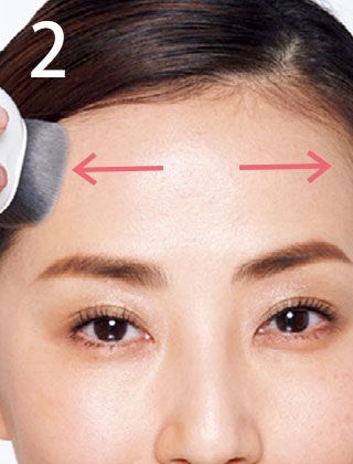 頬や額、あごなども、ブラシを垂直に当てたまま、まっすぐに滑らせるのが上手に塗るコツ。細かい部分はブラシでフィットさせましょう。