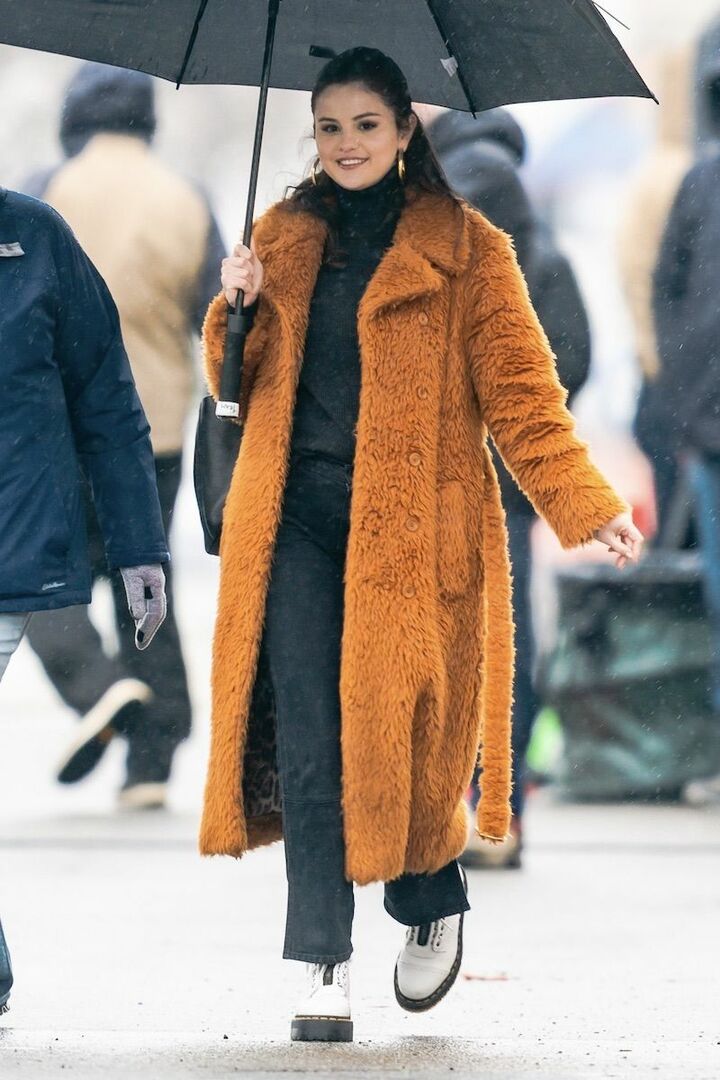 最高気温11度の雨の日は、実際の気温よりも体感温度が低く感じられるため、しっかりと防寒して。セレーナ・ゴメスは黒のタートルニットとパンツのワンツーに、キャメルのボアコートを重ねて温感をアピール。シューズは撥水性があったり防水できるものが安心。