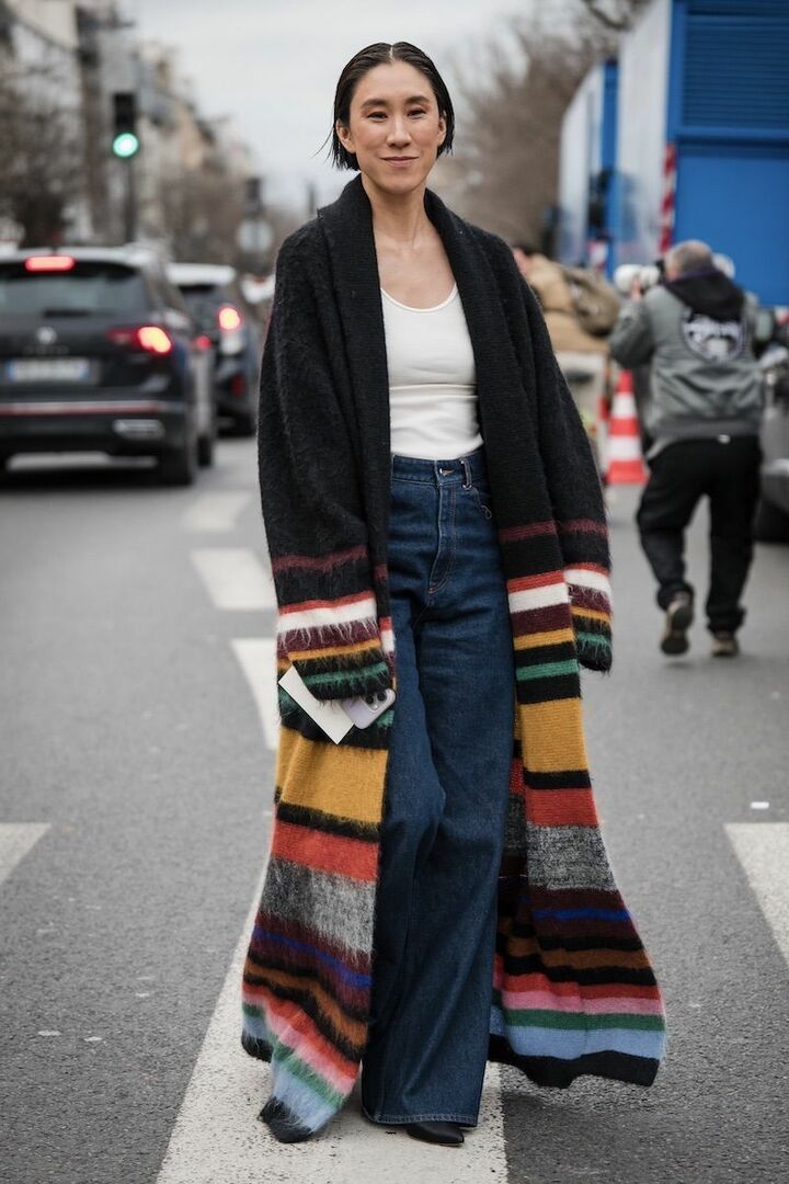 コートを脱いだときでも暖かくいられるよう、ニットをフル活用しましょう。シエナ・ミラーは厚手ニットとボアアウターをベージュでリンクし、ぬくもりを表現。ベージュの色味に変化をつけながら、異素材ミックスにするとぼんやりしません。白パンツと黒ブーツでコントラストを授ければパーフェクト。