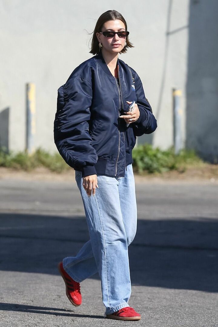 最低気温11度の日は、夕方以降だんだんと肌寒くなってきます。そんなときは程よい防寒力を備え、荷物としてもかさばりにくいブルゾンがぴったり。ヘイリー・ビーバーはネイビーのブルゾンにライトブルーのデニムパンツを合わせ、色の調和を意識。寒色であるブルーに、暖色の赤スニーカーを効かせました。カジュアルになりすぎないようにプラスしたイヤリングがポイント。