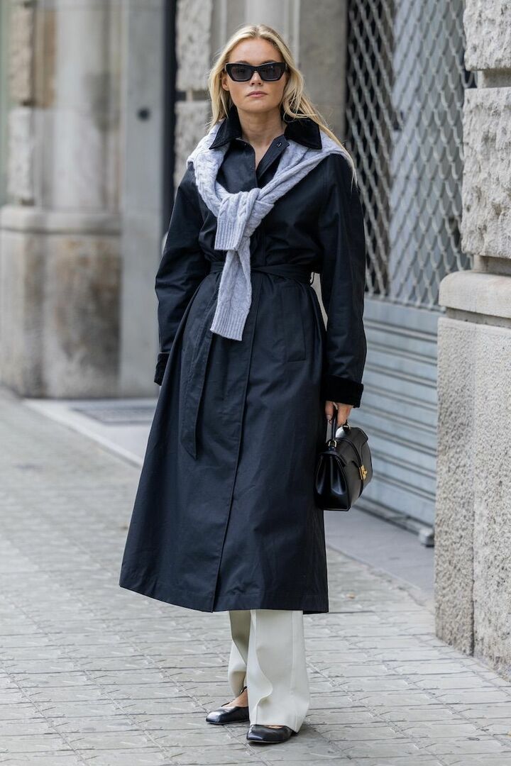 タイムレスな魅力を放つロングトレンチコートを迎えて、肌寒さに対応させながらクラシカルなオーラを放って。定番のベージュももちろん素敵ですが、ネイビーを選ぶとぐっと知的な雰囲気に。コートを共布ベルトでマークしつつ、ライトグレーのケーブルニットをアクセサリー代わりに投入して立体感をアップ。