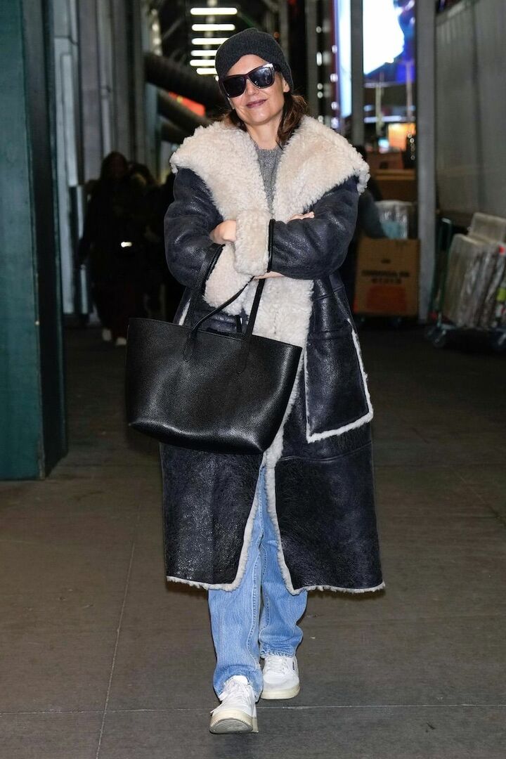 至福のぬくもりで包み込んでくれるムートンコートなら、見た目にもあたたかな印象が叶います。ケイティ・ホームズは、黒のロングムートンコートでインパクトを生み出し、モダンさを演出。軽やかなライトブルーデニムパンツと白スニーカーでカジュアルダウンすると、小粋なムードが漂います。