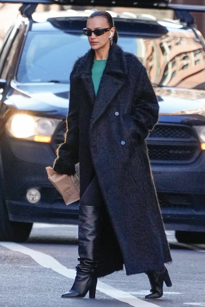 膝下をしっかりカバーできるロングブーツは、スタイルアップも叶えてくれる優秀選手。イリーナ・シェイクは毛足のある黒のマキシコートに、くしゅくしゅとした形のロングブーツを合わせ、モダンさを演出。ブライトカラーのニットを迎え、キャッチーにきめて。