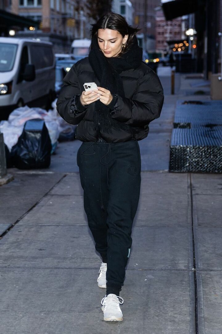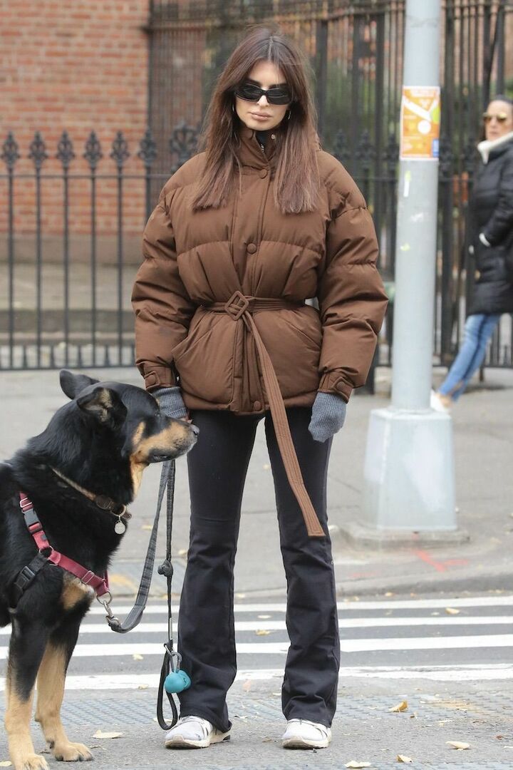 防寒性、保温性に長けたダウンジャケット、ダウンコートでぬくもりを逃さないようにすれば、寒い日の外出も億劫になりません。エミリー・ラタコウスキーは、ベルト付きのダウンジャケットを指名し、さらにフレアパンツを合わせてしなやかさをアピールしました。ブラウン×黒が重くならないよう、白スニーカーをオン。