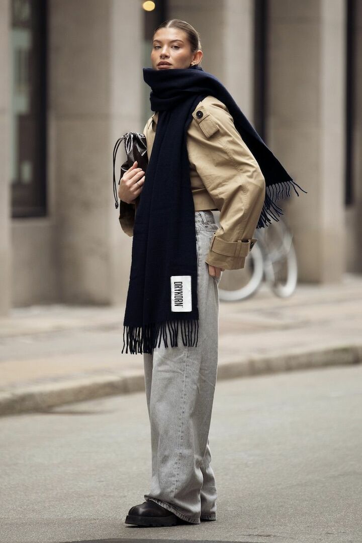 端境期にちょうどいいショート丈のトレンチコートを活用。大判マフラーをプラスすると防寒力が高まるだけでなく、躍動感が生まれて着映えが実現。ワイドパンツを合わせてもスタイルアップできるのは、濃い色のマフラーをラフに垂らしてIラインを強調しているから。