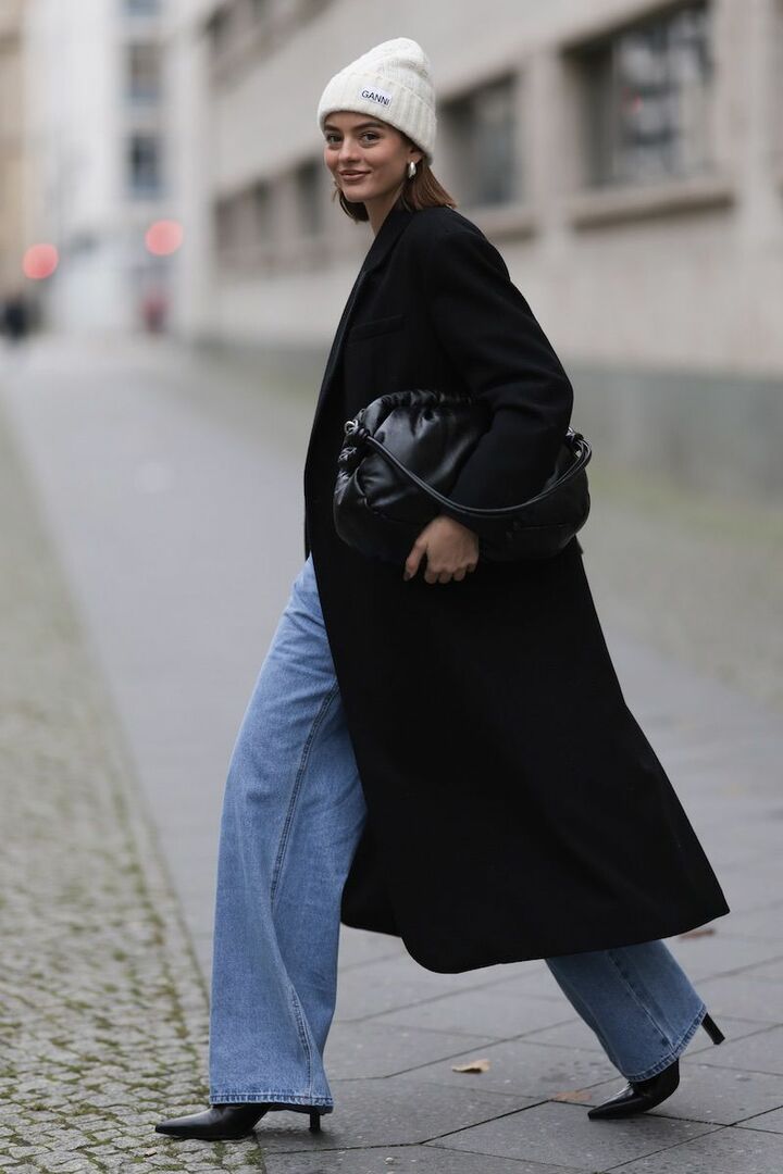 足元の防寒力をアップさせるために、ブーツをうまく取り入れましょう。さまざまなコーディネートにマッチする黒のショートブーツを日々の相棒に。ロングコート×ブルーワイドデニムパンツの着こなしに、黒ショートブーツとニットキャップを合わせメリハリシルエットを形成。