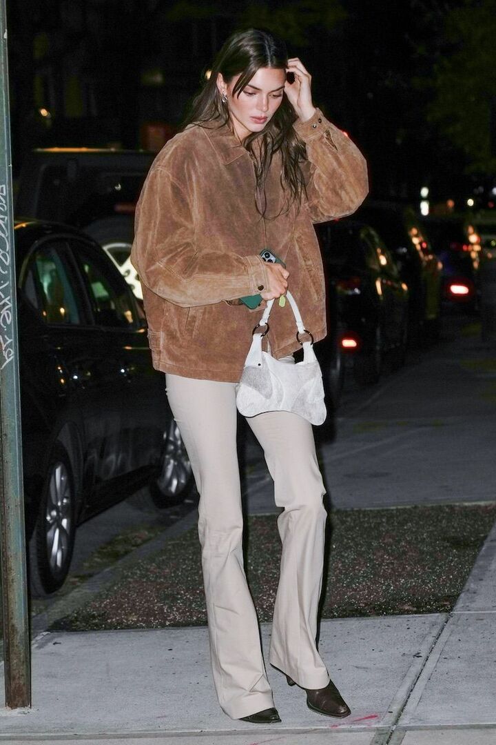 最低気温11度の夜は、本格的な冬コートまではいかずとも、適度な防寒力を備えたアウターがあると安心です。ケンダル・ジェンナーはキャメルのスウェードブルゾンを取り入れ、見た目にもあたたかく。オフホワイトのパンツとビターブラウンシューズを合わせ、まろやかな色合わせへ。