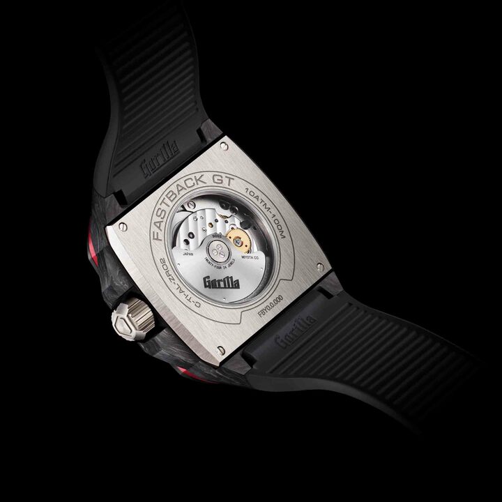 裏蓋は耐傷性の強いサファイア・クリスタル・ガラスによるシースルー構造でムーブメントの動きを楽しめる。また、その円周にはコレクション名とゴリラウォッチのシンボルである素材の組み合わせが刻印される。ケース素材にはチェッカーフラッグ柄のフォージド・カーボン、アノダイズド・アルミ、チタン、セラミック、ブレスレットにはチタンバックルをあしらう、ハイブリッド・バイトン・ラバーストラップが使用され、独特の雰囲気を作りあげている。