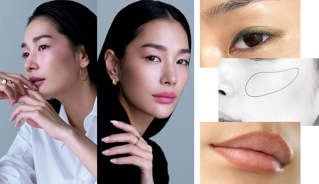 チークは内側から血色が浮かび上がるようなセミマットなコーラルカラーbを頬骨に沿って勾玉状に入れる。目元の血色感と自然につながってフェースラインの下垂を補正。cのリップは、目元が印象的なぶん、色は引き算。みずみずしいニュートラルベージュでナチュラルな立体感のある唇に。