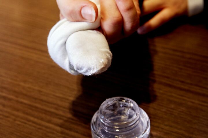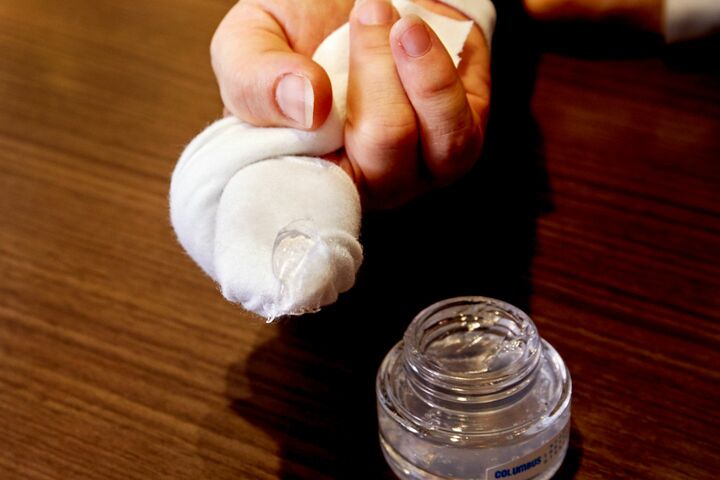 専用のローションを3滴くらい綿100%のクロスに落として、アイメイクを取るようなイメージで、「くるくる」と優しく円を描くよう全体を磨きましょう。