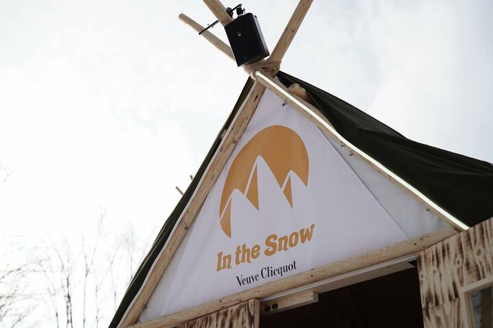 ニセコひらふエリアの中心にある「ひらふ十字街」に期間限定で現れた三角屋根のロッジ。温かなイエローのライトに照らされたスタンディングバーと、北欧スタイルのテントの中に出現する心地よいラウンジで、ヴーヴ・クリコと極上のフードペアリングを提供しています。