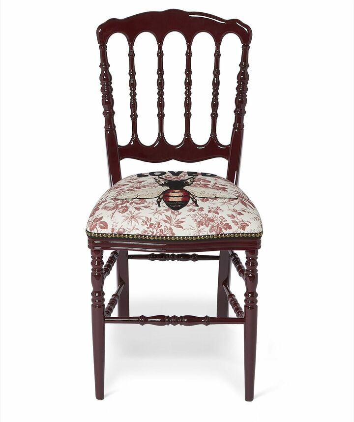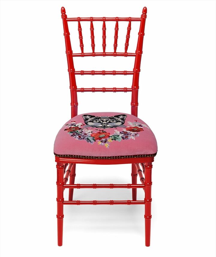 さらには、自宅の空間をよりアレッサンドロ色に染める、カラフルな木製フレームのダイニングチェアもお目見え。クッションパッドにあしらわれたキャットやビーのアイコンモチーフが、グッチガーデンのムードを牽引します。