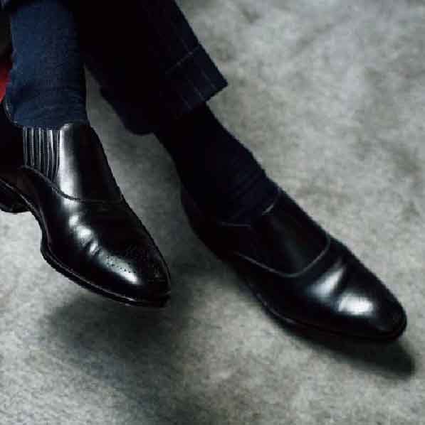 カルミナのサイドエラスティックシューズを合わせ、ウィンストン・チャーチルを偲ばせるレイジーマンスタイルを気どる
