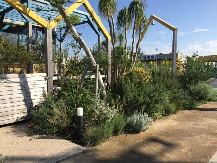 キーワード:個性的なグリーン、オリーブ、ローズマリー、ハーブ、芝生、多肉植物、エアープランツ、古材、アイアン、ブリキ