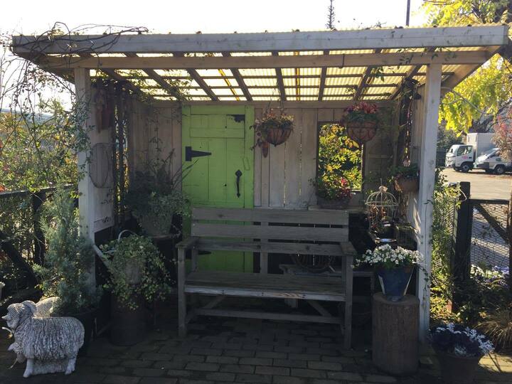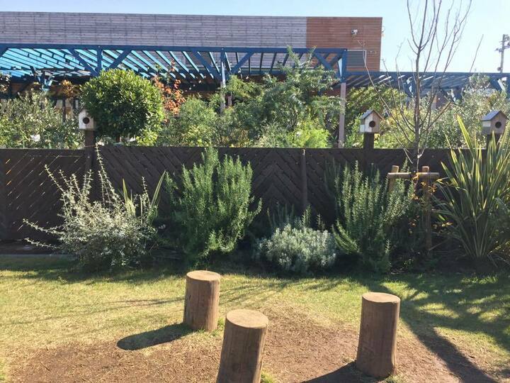 キーワード:枕木、レンガ、タイル、ウッドフェンス、ウッドデッキ、芝生、アイビー、シマトネリコ、オリーブ、ジューンベリー、ミモザ、ローズマリー、ラベンダー、バラ、アナベル、その他ハーブや草花、小屋