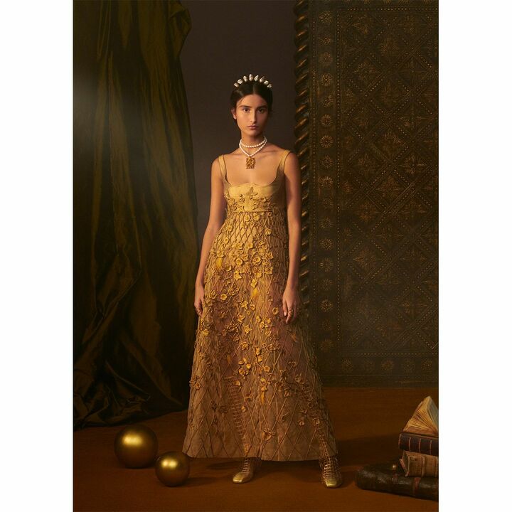 メゾンのアイコニックなドレス「Miss Dior (ミス ディオール)」のゴールドカラーを纏ったルックも印象的です。
