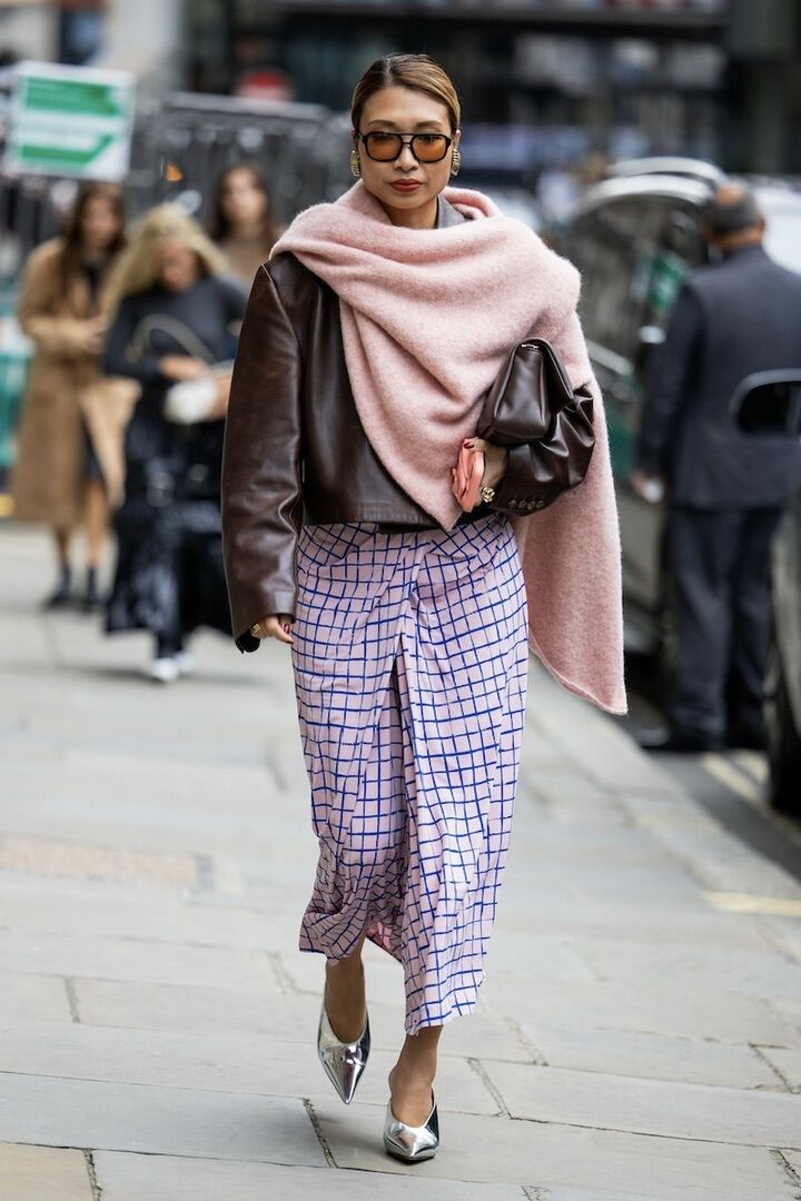 優しいピンクの大判ニットスカーフと、手描き風のチェック柄がユニークなラベンダーロングスカートをアクセントにして、着映え力をアップ。辛口なレザージャケットとキレの良いメタリックシルバーパンプスがあれば、ポップに傾かず都会派ムードを両立できます。