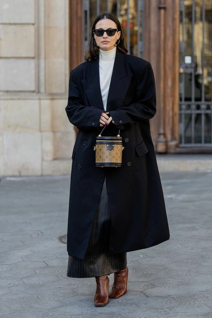 パワーショルダーの黒ロングコートと、ピンストライプ模様が施された黒レザーロングスカートのストイックな着こなし。しなやかさを両立するために、白のハイネックニット、キャメルのバッグ、ブラウンブーツといった優しい色をミックス。