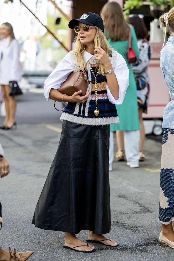 白シャツにカラフルなノースリーブニットとゴールドネックレスを重ねたら、さらにニットのなかの色を拾ったキャップとレザーロングスカートを合わせ、ミックススタイルをエンジョイ。ごちゃっとして見えないのは、ごくシンプルな黒のビーチサンダルで引き算しているから。