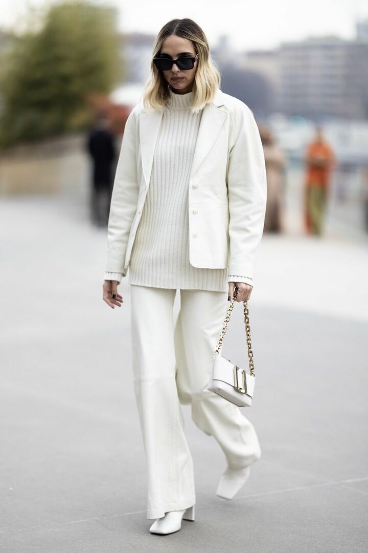 オールホワイトコーディネートがのっぺりしないよう、ストライプ模様のようなリブニットと、形に特徴のあるフレアパンツを採用。イノセントな白の装いでも甘くなりすぎないのは、ストイックなスクエアトゥブーツが効いているから。