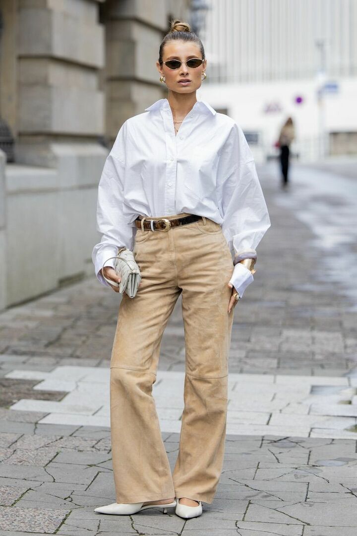 プレーンな白シャツは、ボリュームスリーブデザインを手に取ってマンネリを脱却。太もも周りに余白があり、膝から裾にかけて広がるベージュフレアパンツがスタイルアップと品の良さを叶えます。シューズはトップスの色を繰り返したポインテッドトゥにして、シャープに整頓。