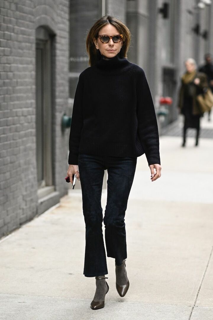 トップスとパンツを黒で繋いだ着こなしは、ニットとスエードという異なる質感をミックスして間延びを解消。さらにクロップド丈のフレアパンツをセレクトし、シルエットに抑揚をつけて。ブラウンのソックスとツヤパンプスが品のよさに貢献。
