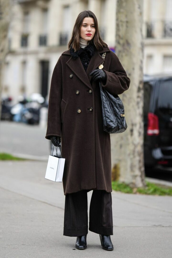 すとんと縦に落ちるロングコートを組み合わせ、パンツのフレアラインを引き立てて。ビターなブラウンと黒のダークカラーに任せ、シックなムードをオン。タートルニットとモコモコジャケットを仕込んだり、辛口レザーグローブを足すと単調になりません。
