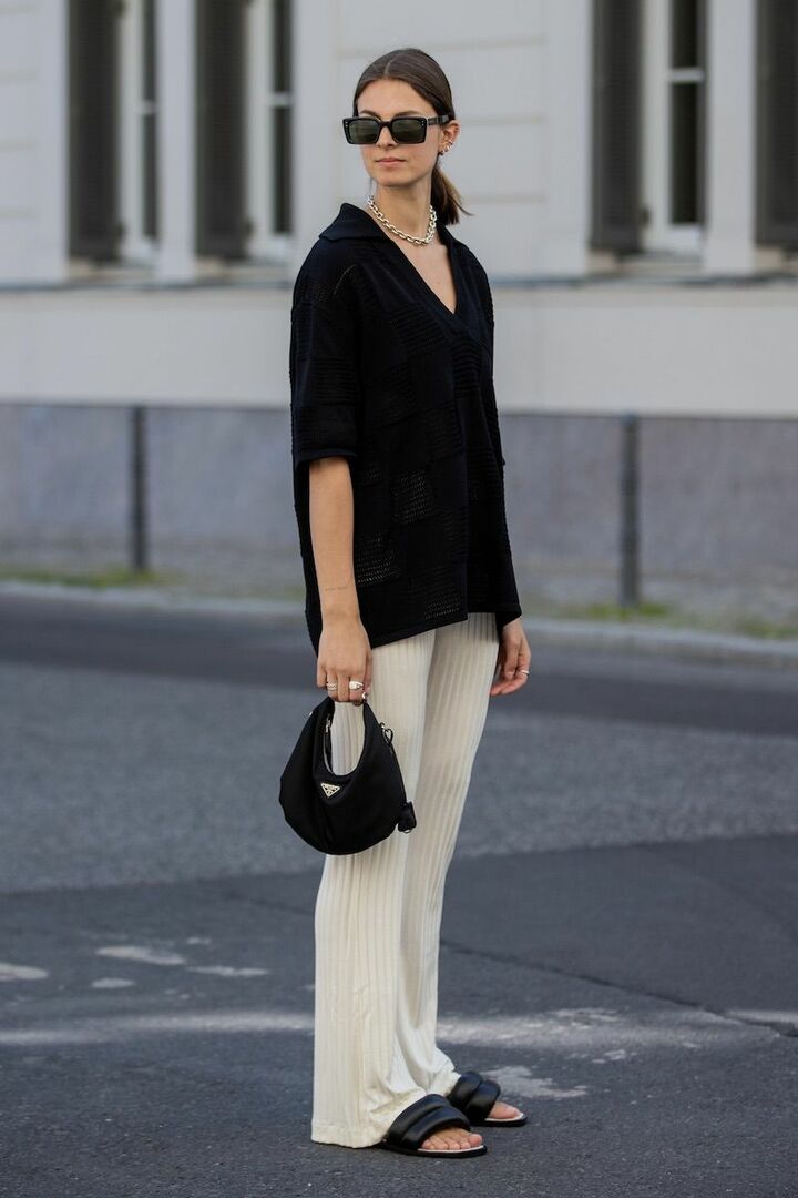 ゆったりとした黒の半袖シャツと、白のリブフレアパンツ、黒フラットサンダルのトリオでコンフォートな着こなしへ。ゆるりとした着こなしは、モノトーンに任せてルーズに陥らないよう調整。さらにシルバーネックレスを足し、都会派ムードを後押し。