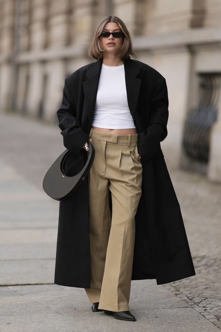 モードな黒パワーショルダーコートに、キレのよい白カットソーを組み合わせ、ぱきっと格好よく。ストイックなモノトーンを品よく整えるために、親近感のあるベージュのフレアパンツを迎えて。