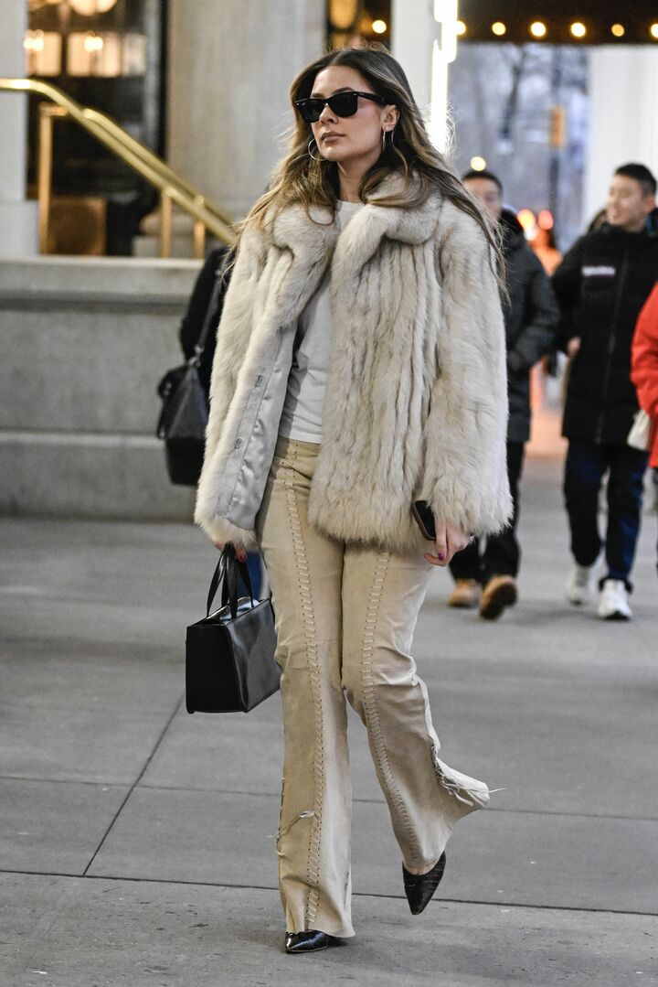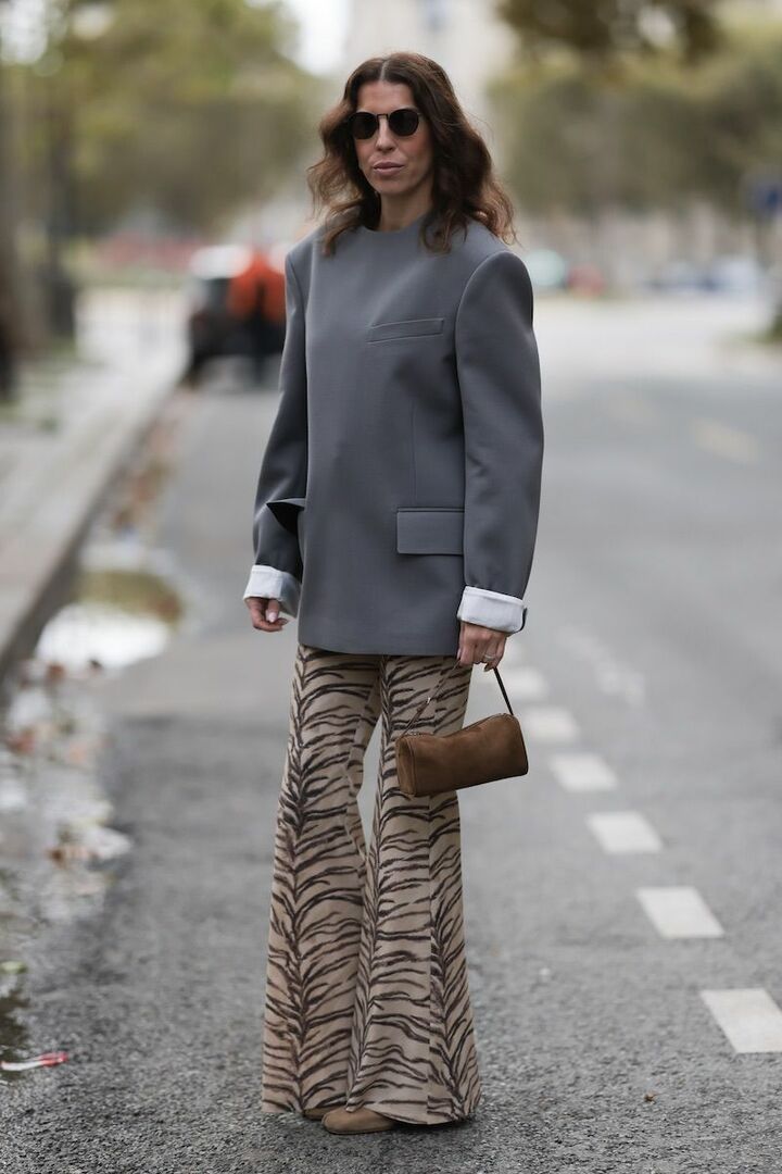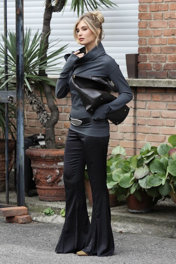 白、ブラウン、ベージュの柔和な配色の着こなしを披露したソフィア・ベルガラ。ショート丈のオフショルダートップスと、ハイウエストパンツを組み合わせスタイルアップに繋げて。ブラウスのぽわんと膨らむ袖とパンツのフレアが呼応して、しなやかさが引き上がりました。