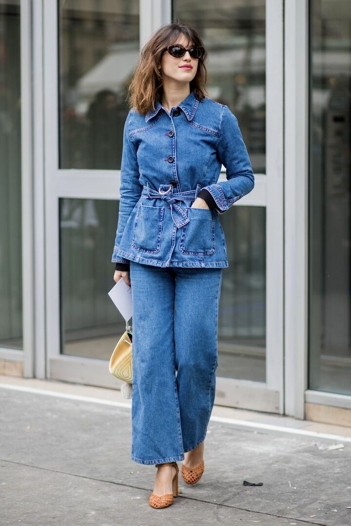カジュアルなデニムONデニムスタイルは、ジャケットをウエストマークしたり、フレアパンツを採用してメリハリシルエットを描くとしなやか。レトロなキャメルのメッシュパンプスが品の良さを引き上げてくれます。