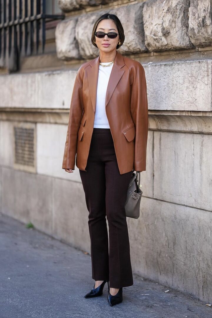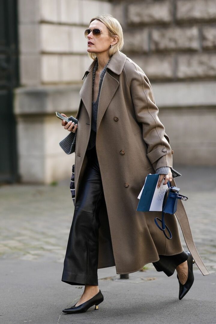 それひとつで甘辛ミックスが楽しめる、黒レザーのフレアパンツを採用。パンツのフレアに馴染ませるように、ふわっと広がるコートをレイヤードすれば、ボトムがかさばらず好バランス。黒やモカブラウンの配色に、差し色のブルーがよく映えて。