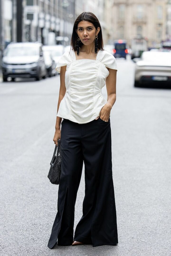 心ときめく、ギャザーブラウスとワイドフレアパンツの着こなし。臆せずロマンティックに浸れるのは、甘さを中和してくれるモノトーンで構成しているから。立体感が手に入り、単調にならないのも嬉しいポイント。