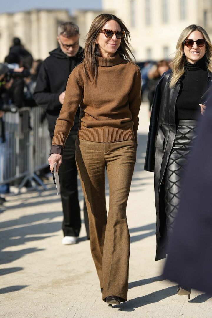 ブラウンコーディネートが地味にならないのは、明るい色味を選んだり、フレアパンツの華やかさを頼りにしているから。ニットのインに濃いブラウンのシャツを仕込み、さりげないお洒落心を効かせて。
