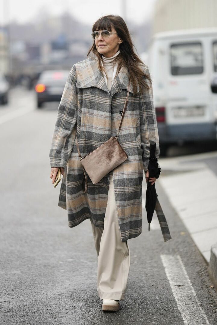 あたたかみがあって、甘い印象のチェック柄コートにマッチするのは、フェミニンなクリームホワイトのフレアパンツ。コートとパンツ、いずれもゆとりを持たせたことで、程よい抜け感が備わりこなれ見え。
