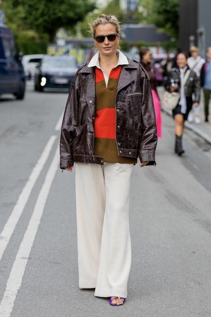 白フレアパンツは、あらゆるカラーと馴染むのがメリットのひとつ。鮮烈な赤のボーダーニットとパープルサンダル、軽やかなパンツが合わされば、生き生きとした表情に。程よく辛口なビターブラウンのジャケットを重ね、大人らしく整えました。