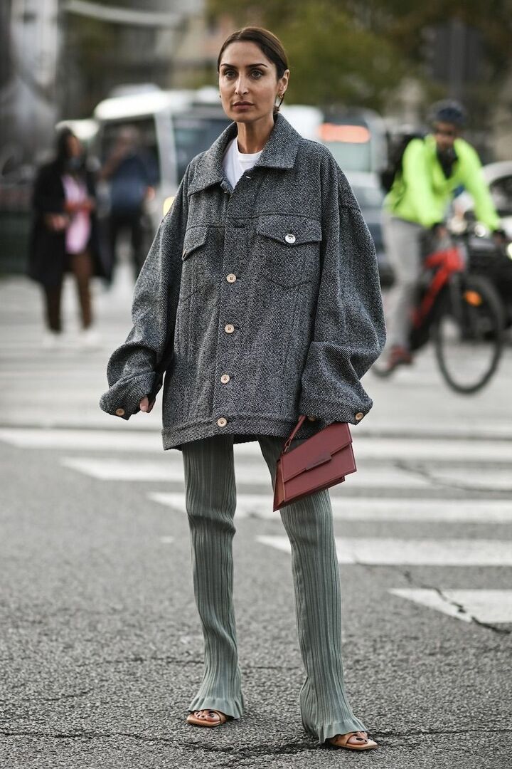 細身のリブパンツは、フレアシルエットなら“部屋着感”を払拭できます。オーバーサイズのシャツジャケットをプラスし、抑揚をたっぷりとつけて。グレイッシュな色味でまとめ、調和の取れた着こなしを完成させました。