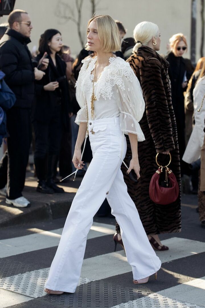 透け感のあるレースブラウスが目を引くホワイトコーディネート。ストレートラインのパンツだと、やや下半身がさっぱりしがち。ボリュームのあるトップスと釣り合いが取れるよう、緩やかに広がるフレアパンツを指名。