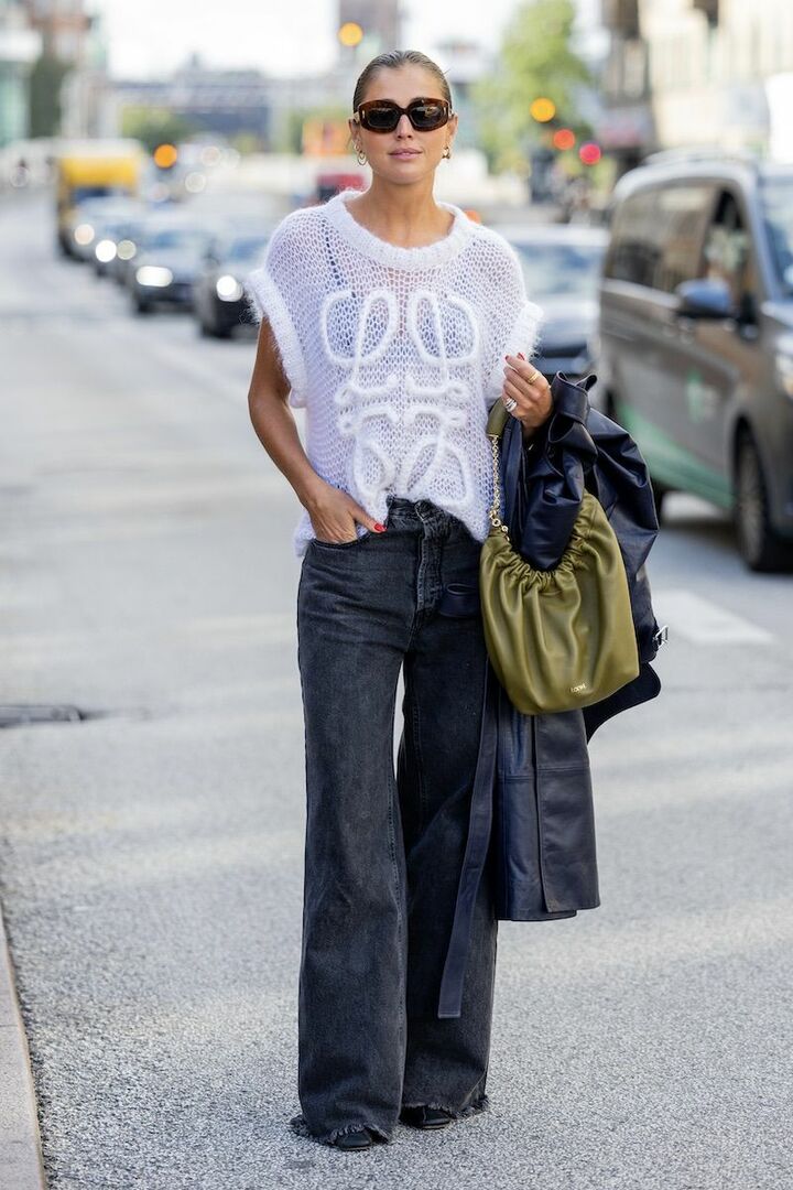 身体が泳ぐオーバーサイズの白メッシュニットと、膝下をカバーするチャコールグレーデニムフレアパンツ。余白をつくればストイックなモノトーンにこなれ感が宿ります。ヘアはタイトにまとめ、顔周りをコンパクトに見せるとバランスアップをクリア。