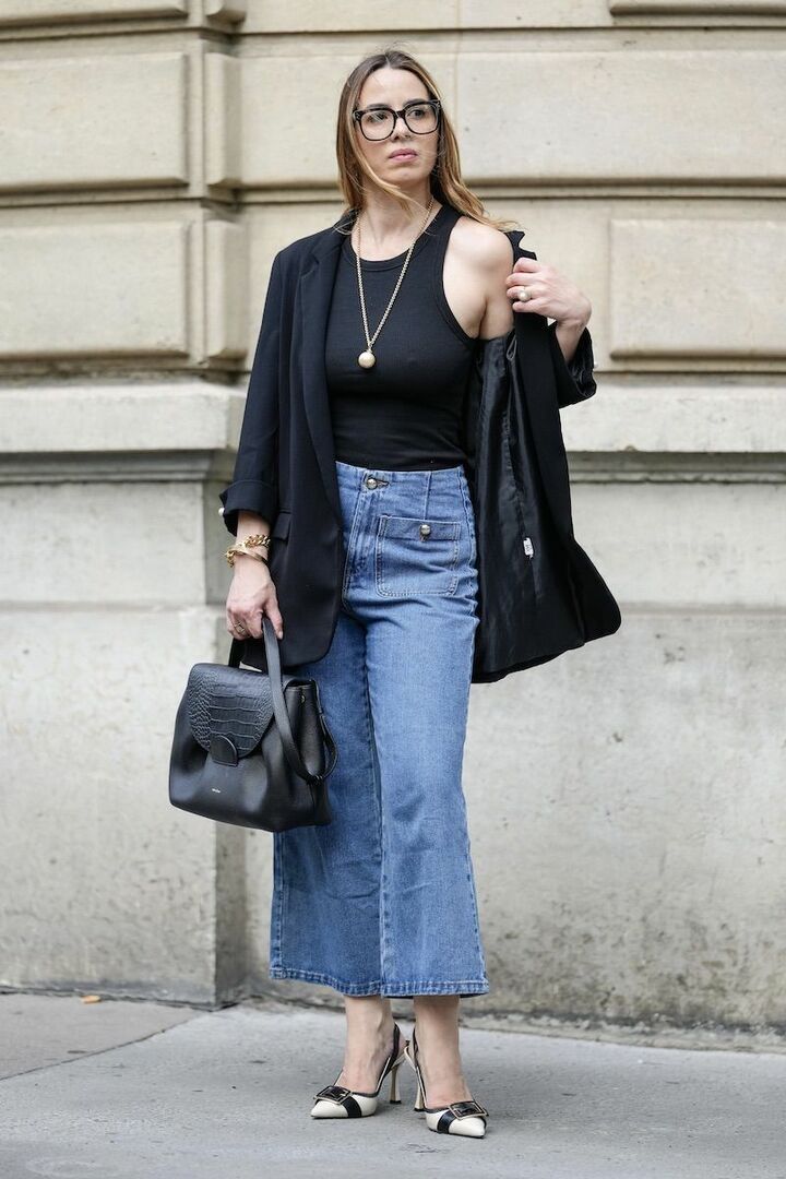 しなやかさを持ち合わせたフレアシルエットのブルーデニムパンツは、端正な黒ジャケットにもしっかりマッチ。クロップド丈×フレアのパンツにシャープなスリングバックパンプスを添え、足首周りをきゅっと華奢に演出。