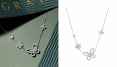「ザ グラフ バタフライ コレクション」も、美しく羽根を広げ羽ばたくさまをローレン・グラフの人生になぞらえたブランドのアイコンのひとつ。ピンクダイヤモンドがバタフライのシェイプに沿ってパヴェセッティングされたデザインは、可憐で上品なムードが魅力です。