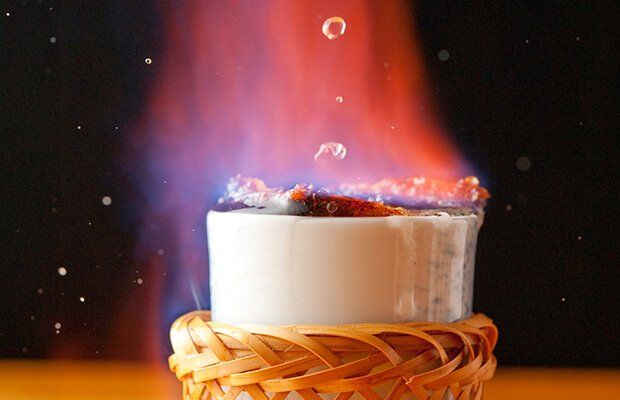 ふぐ料理に欠かせない『ヒレ酒』。辛口の酒に火を点けることでマイルドな味わいに。炭火で焼いたヒレの香りがたまりません。写真はつぎ酒の様子