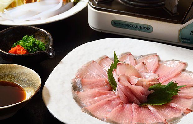 供されるのは、天然の寒ブリを使った刺身とブリしゃぶを含めた魚貝料理の数々。脂がたっぷりとのった日本海側で獲れるブリを、築地市場や足立市場から仕入れ、もっとも旨味が増すタイミングまで寝かせます。
